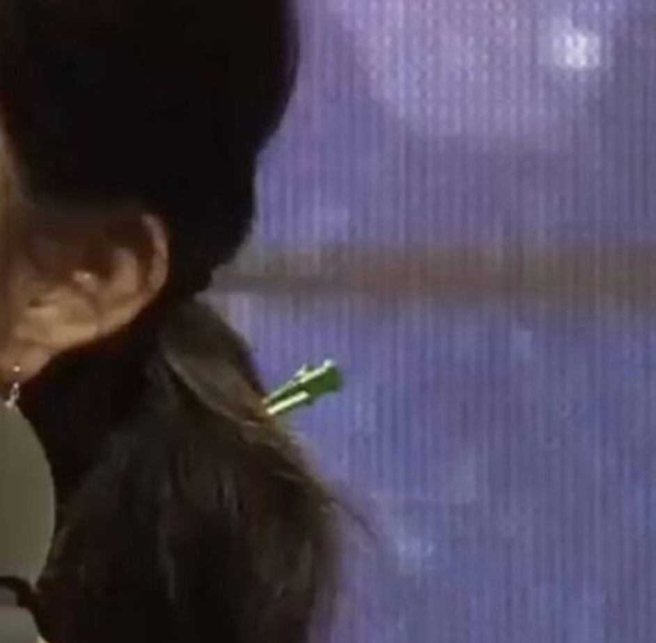 Desafortunadamente, su estilista debe haber estado apresurándose para prepararla para el escenario y dejó una horquilla verde en la coleta de Irene.